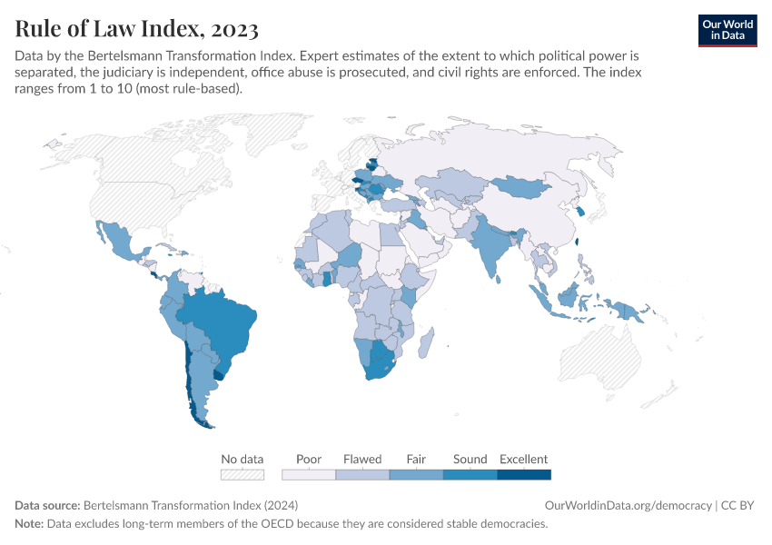 “Data Page: Rule of Law Index”, part of the following publication: Bastian Herre, Lucas Rodés-Guirao, and Esteban Ortiz-Ospina (2013) - “Democracy”. Data adapted from Bertelsmann Transformation Index. Retrieved from https://add-force-datapage.owid.pages.dev/grapher/rule-of-law-index-bti [online resource]How to cite this data