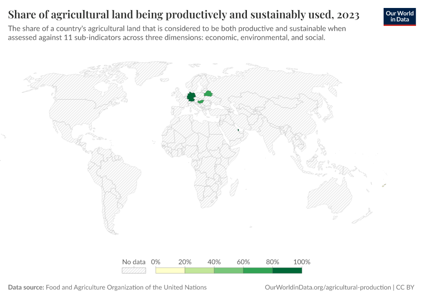 Food and Agriculture Organization of the United Nations – processed by Our World in Data. “Share of agricultural land being productively and sustainably used” [dataset]. Food and Agriculture Organization of the United Nations, “Data from multiple sources” [original data]. Retrieved March 2, 2026 from https://add-force-datapage.owid.pages.dev/grapher/share-of-agricultural-land-being-productively-and-sustainably-used