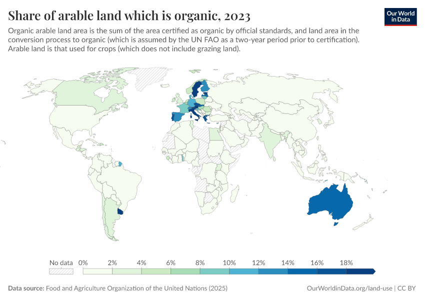 Food and Agriculture Organization of the United Nations (2025) – with major processing by Our World in Data. “Share of arable land that is organic – UN FAO” [dataset]. Food and Agriculture Organization of the United Nations, “Land, Inputs and Sustainability: Land Use” [original data]. Retrieved March 2, 2026 from https://add-force-datapage.owid.pages.dev/grapher/share-of-arable-land-which-is-organic