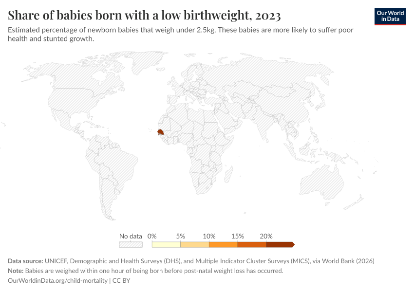 “Data Page: Share of babies born with a low birthweight”. Our World in Data (2026). Data adapted from UNICEF and World Health Organization (WHO), via World Bank. Retrieved from https://add-force-datapage.owid.pages.dev/grapher/share-of-low-birthweight-babies-born [online resource]How to cite this data