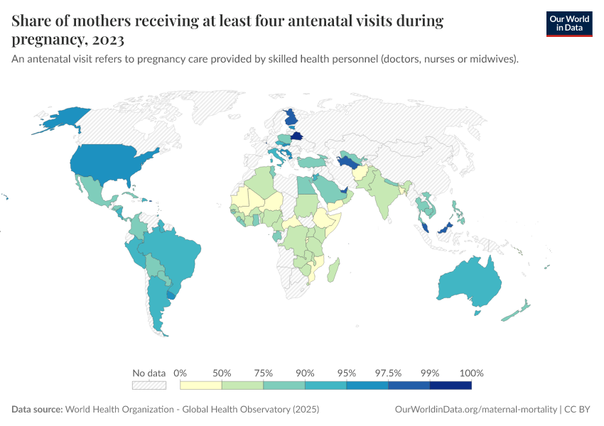 World Health Organization - Global Health Observatory (2025) – processed by Our World in Data. “Share of mothers receiving at least four antenatal visits during pregnancy” [dataset]. World Health Organization, “Global Health Observatory” [original data]. Retrieved March 2, 2026 from https://add-force-datapage.owid.pages.dev/grapher/share-of-mothers-receiving-at-least-four-antenatal-visits-during-pregnancy