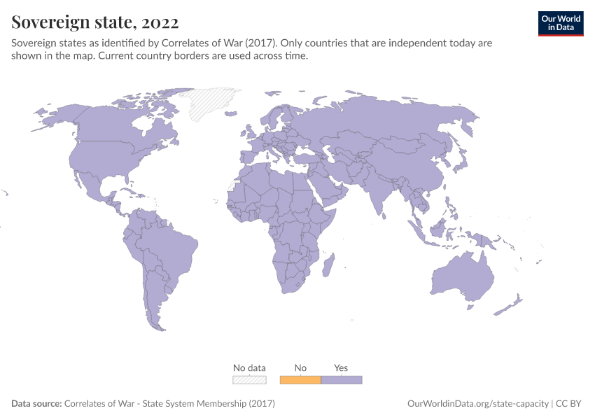 “Data Page: Sovereign state”, part of the following publication: Bastian Herre and Pablo Arriagada (2023) - “State Capacity”. Data adapted from Correlates of War. Retrieved from https://add-force-datapage.owid.pages.dev/grapher/sovereign-state-cow [online resource]How to cite this data
