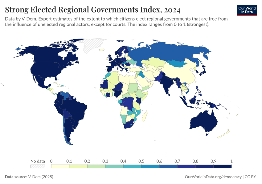 “Data Page: Elected regional governments”, part of the following publication: Bastian Herre, Lucas Rodés-Guirao, and Esteban Ortiz-Ospina (2013) - “Democracy”. Data adapted from V-Dem. Retrieved from https://add-force-datapage.owid.pages.dev/grapher/strong-elected-regional-governments-index [online resource]How to cite this data