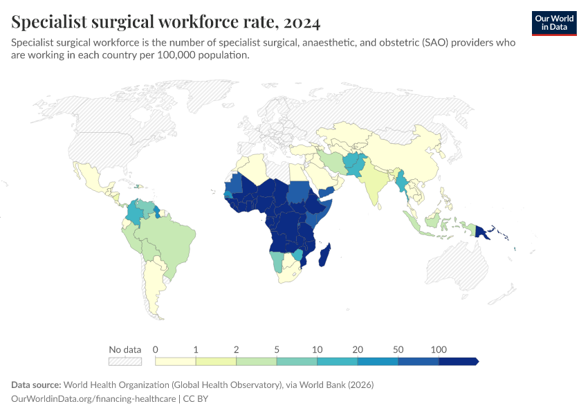 Lancet Commission on Global Surgery, WHO, and BMJ Global Health, via World Bank (2026) – processed by Our World in Data. “Specialist surgical workforce rate” [dataset]. Lancet Commission on Global Surgery, WHO, and BMJ Global Health, via World Bank, “World Development Indicators 125” [original data]. Retrieved March 2, 2026 from https://add-force-datapage.owid.pages.dev/grapher/surgeons-per-100000
