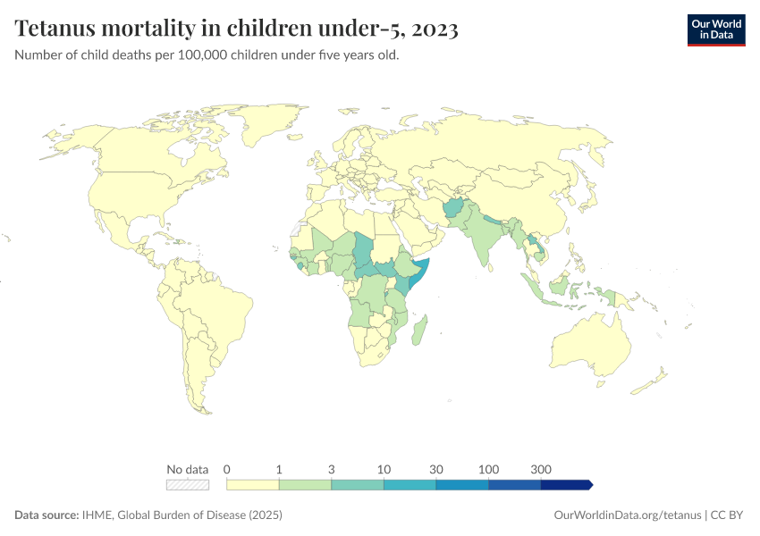 IHME, Global Burden of Disease (2025) – with major processing by Our World in Data. “Tetanus mortality in children under-5” [dataset]. IHME, Global Burden of Disease, “Global Burden of Disease - Deaths” [original data]. Retrieved March 2, 2026 from https://add-force-datapage.owid.pages.dev/grapher/tetanus-mortality-in-children-under-5