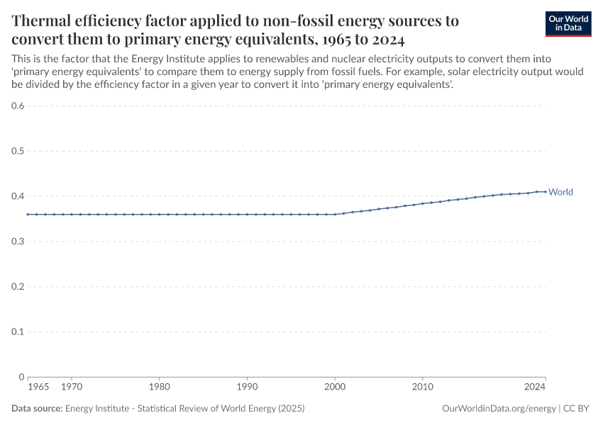 Energy Institute - Statistical Review of World Energy (2025) – with major processing by Our World in Data. “Thermal equivalent efficiency factors” [dataset]. Energy Institute, “Statistical Review of World Energy” [original data]. Retrieved March 2, 2026 from https://add-force-datapage.owid.pages.dev/grapher/thermal-efficiency-factor