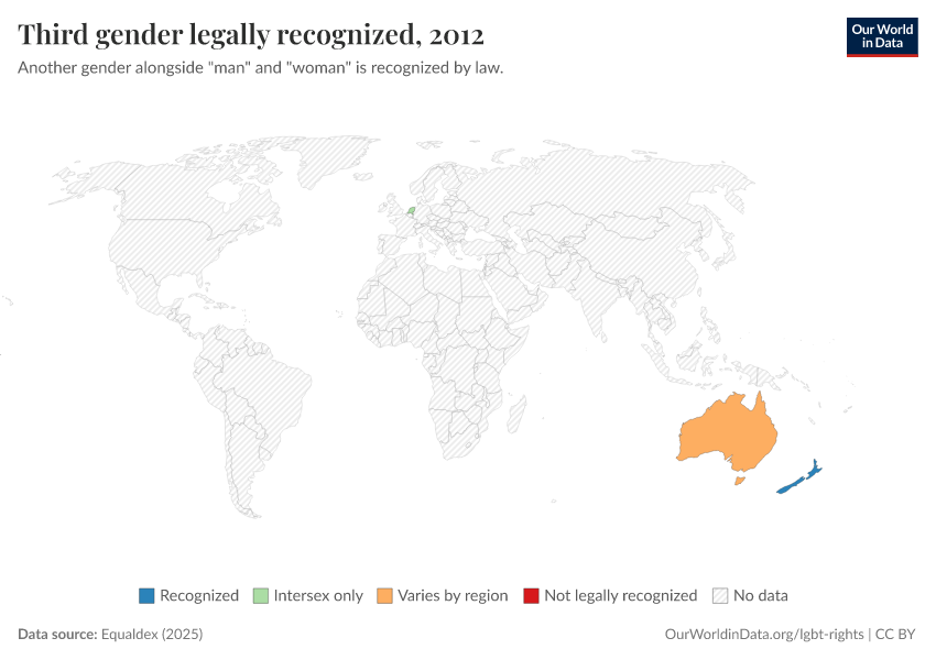 “Data Page: Third gender legally recognized”, part of the following publication: Bastian Herre and Pablo Arriagada (2023) - “LGBT+ Rights”. Data adapted from Equaldex. Retrieved from https://add-force-datapage.owid.pages.dev/grapher/third-gender-recognition-equaldex [online resource]