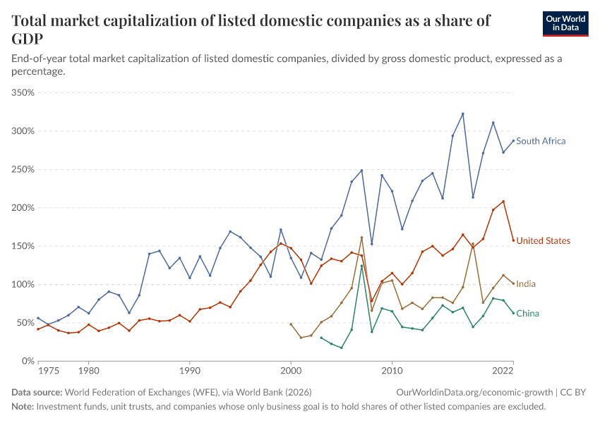 “Data Page: Total market capitalization of listed domestic companies as a share of GDP”. Our World in Data (2026). Data adapted from World Federation of Exchanges (WFE), via World Bank. Retrieved from https://add-force-datapage.owid.pages.dev/grapher/total-market-capitalization-listed-domestic-companies-share-gdp [online resource]How to cite this data