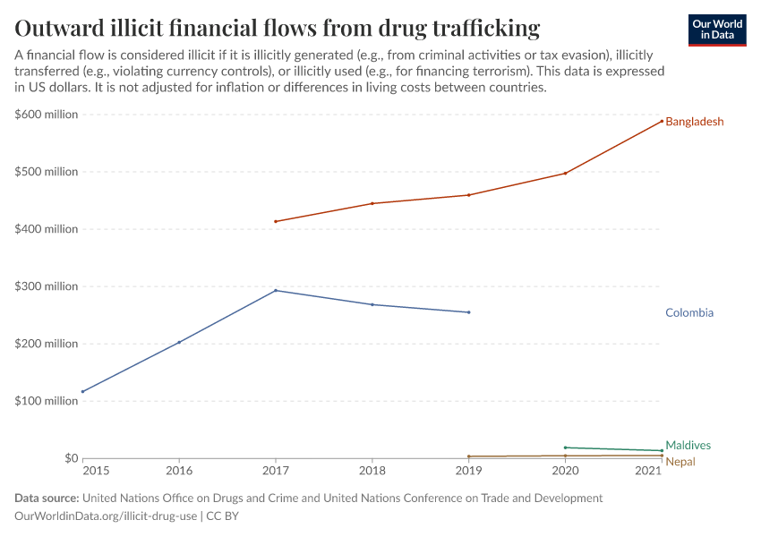 United Nations Office on Drugs and Crime and United Nations Conference on Trade and Development – processed by Our World in Data. “Outward illicit financial flows from drug trafficking” [dataset]. United Nations Office on Drugs and Crime and United Nations Conference on Trade and Development, “Data from multiple sources” [original data]. Retrieved March 2, 2026 from https://add-force-datapage.owid.pages.dev/grapher/total-outward-financial-flows-from-drug-trafficking
