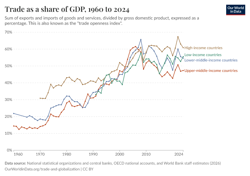 National statistical organizations and central banks, OECD national accounts, and World Bank staff estimates (2026) – processed by Our World in Data. “Trade as a share of GDP” [dataset]. National statistical organizations and central banks, OECD national accounts, and World Bank staff estimates, “World Development Indicators 125” [original data]. Retrieved March 2, 2026 from https://add-force-datapage.owid.pages.dev/grapher/trade-as-share-of-gdp