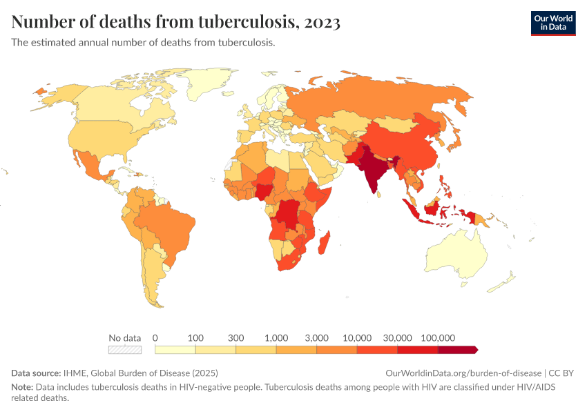 IHME, Global Burden of Disease (2025) – with major processing by Our World in Data. “Number of deaths from tuberculosis” [dataset]. IHME, Global Burden of Disease, “Global Burden of Disease - Deaths” [original data]. Retrieved March 2, 2026 from https://add-force-datapage.owid.pages.dev/grapher/tuberculosis-deaths