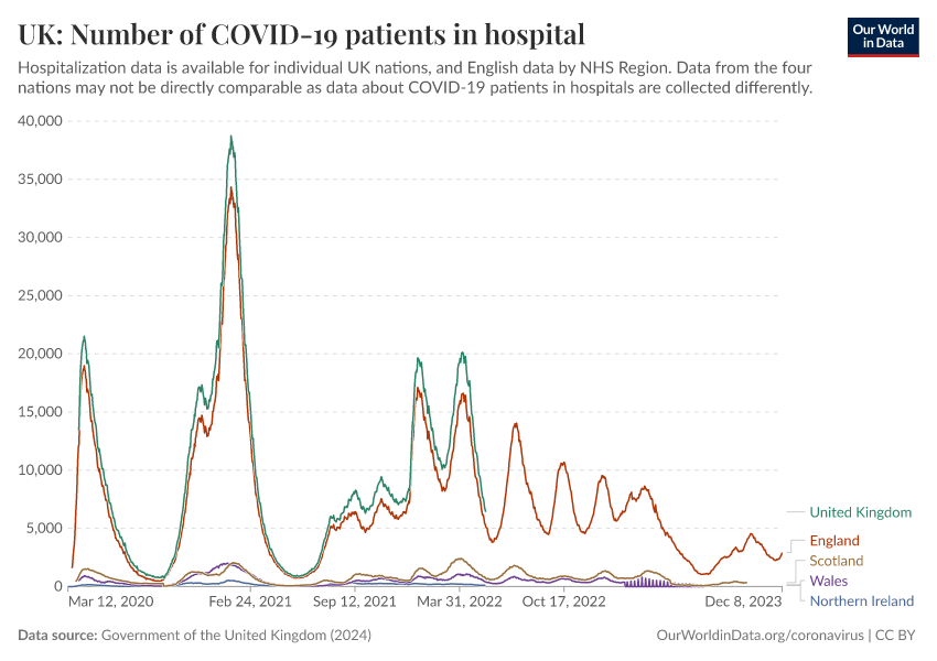Government of the United Kingdom (2024) – with minor processing by Our World in Data. “UK: Number of COVID-19 patients in hospital” [dataset]. Government of the United Kingdom, “UKHSA data dashboard” [original data]. Retrieved March 2, 2026 from https://add-force-datapage.owid.pages.dev/grapher/uk-covid-hospital-patients
