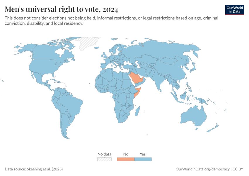 Skaaning et al. (2025) – processed by Our World in Data. “Men's universal right to vote” [dataset]. Skaaning et al., “Lexical Index of Electoral Democracy (LIED) v6.8” [original data]. Retrieved March 2, 2026 from https://add-force-datapage.owid.pages.dev/grapher/universal-suffrage-men-lexical