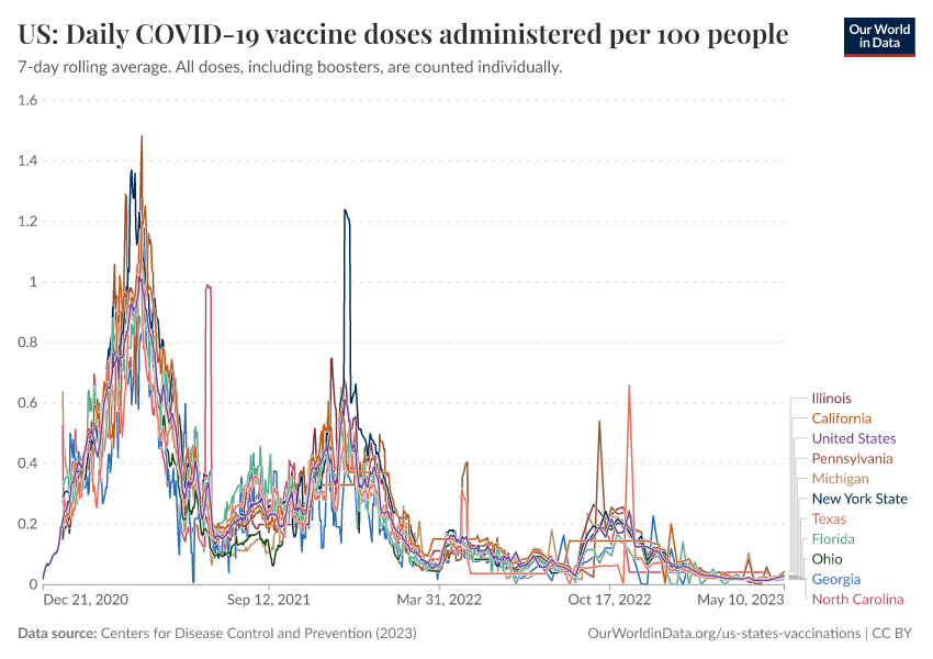 Centers for Disease Control and Prevention (2023) – processed by Our World in Data. “US: Daily COVID-19 vaccine doses administered per 100 people” [dataset]. Centers for Disease Control and Prevention, “COVID-19, Vaccinations (United States)” [original data]. Retrieved March 2, 2026 from https://add-force-datapage.owid.pages.dev/grapher/us-daily-covid-vaccine-doses-per-100