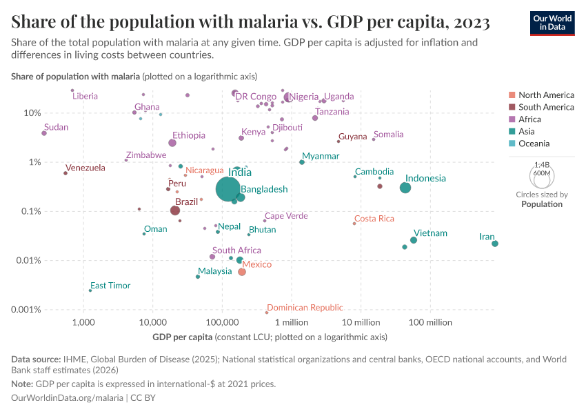 In the chart below, you can see each country’s prevalence of malaria compared to their GDP per capita.