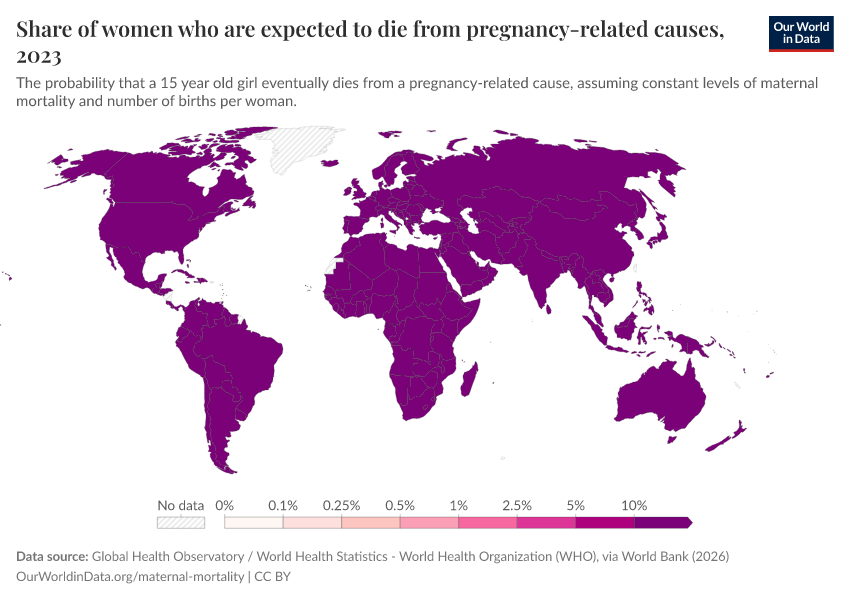 In the chart, we see estimates of the share of women who would die from maternal causes in their lifetime.