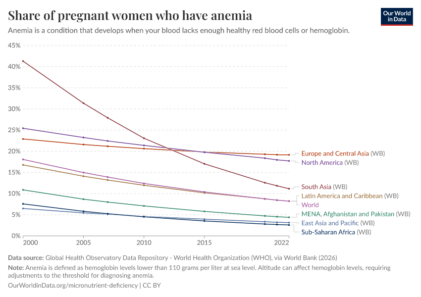 In the chart, we see the prevalence of anemia in pregnant women. Globally, around a third of pregnant women worldwide are anemic.