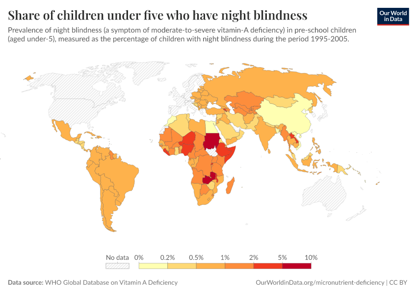 In the map, we see the prevalence of night blindness in children younger than 5 years old over the period 1995–2005.