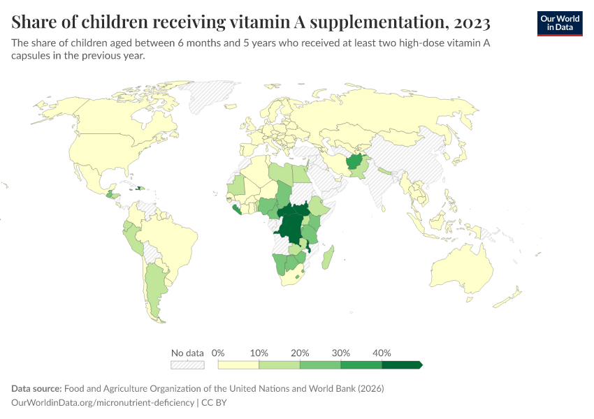 Vitamin A supplementation is relatively common in many countries in Africa and South Asia, although some countries still have low rates of supplementation.
