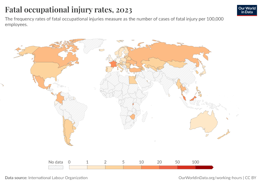 This indicator measures the rates of fatal and non-fatal occupational injuries by country, in terms of the number of injuries per 100,000 employees. An injury in this context refers to any personal injury, disease, or death resulting from an occupational accident; it does not, therefore, include occupational disease, which is the result of exposure over a period of time to risk factors related to the work activity.