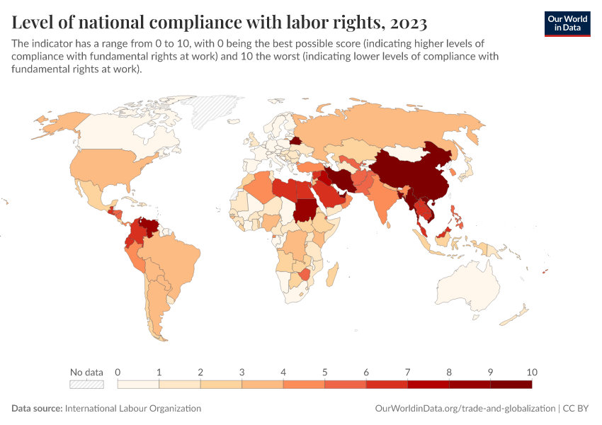 This indicator is measured by coding against a set of evaluation criteria textual sources from International Labour Organization (ILO) reports and national legislation. Values of the indicator range from 0 to 10, with 10 representing the lowest (worst) level of compliance.