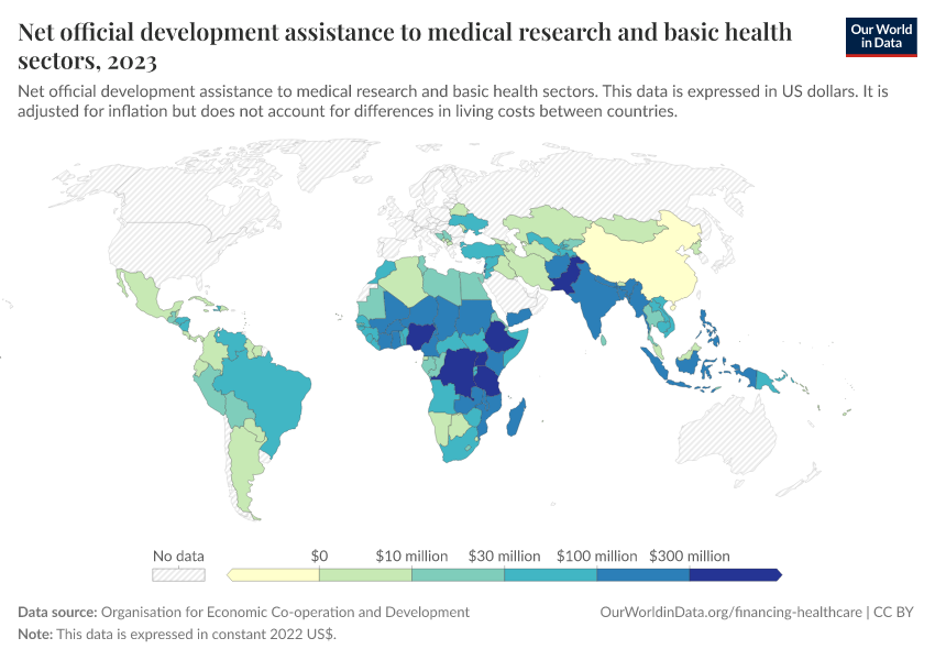 This indicator is measured as disbursements of official development assistance (ODA) and other official flows to the medical research and basic health sectors.