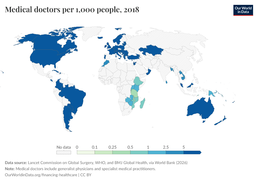 Health worker density is the size of the health workforce per 1,000 people. It is measured here based on the density of physicians, surgeons, nurses and midwives, dentistry and pharmaceutical personnel.