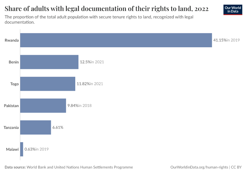 The interactive visualizations show data for this indicator. The first chart shows data on indicator 1.4.2(a) for the share of adults with legal documentation of their rights to land, and the second chart shows data on indicator 1.4.2(b) for the share of individuals who perceive their rights to land as secure.