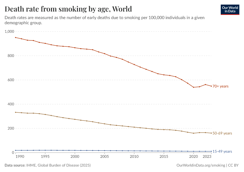 Here, we see that death rates from smoking are much higher in people older than 70 years old, followed by those aged 50 to 69.