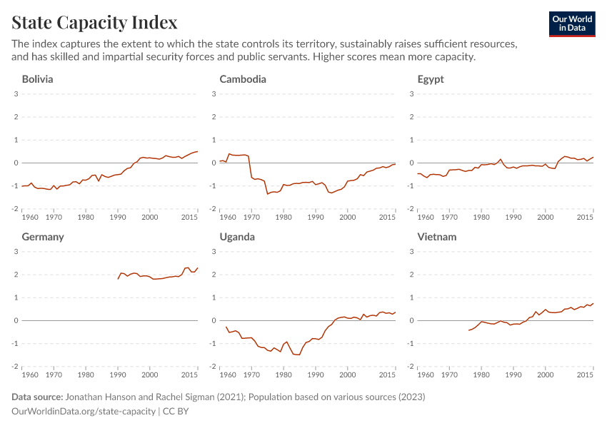 Understanding state capacity is crucial because it shapes a country's ability to address its many challenges. On this page, you can find related data and visualizations on how state capacity differs around the globe and how this has been changing over time.