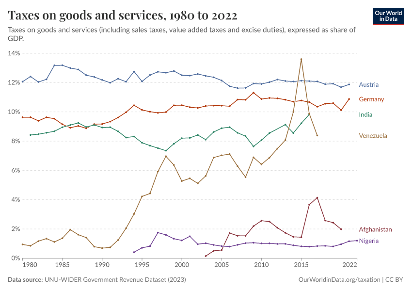 The visualization provides an overview of revenues from the taxation of goods and services over recent decades. The estimates account for sales taxes, value-added taxes, and excise duties; and are expressed as a share of GDP.