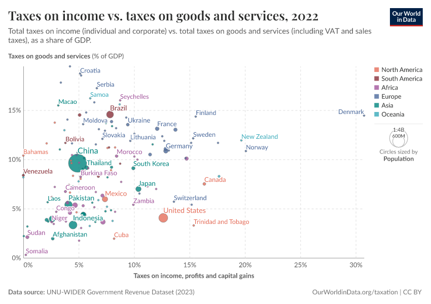 The next visualization plots total revenue from taxes on income and profits (horizontal axis) against revenue from taxes on goods and services (vertical axis), both expressed as a share of GDP.