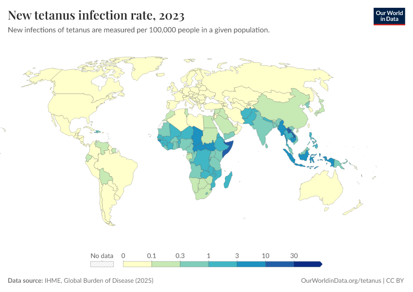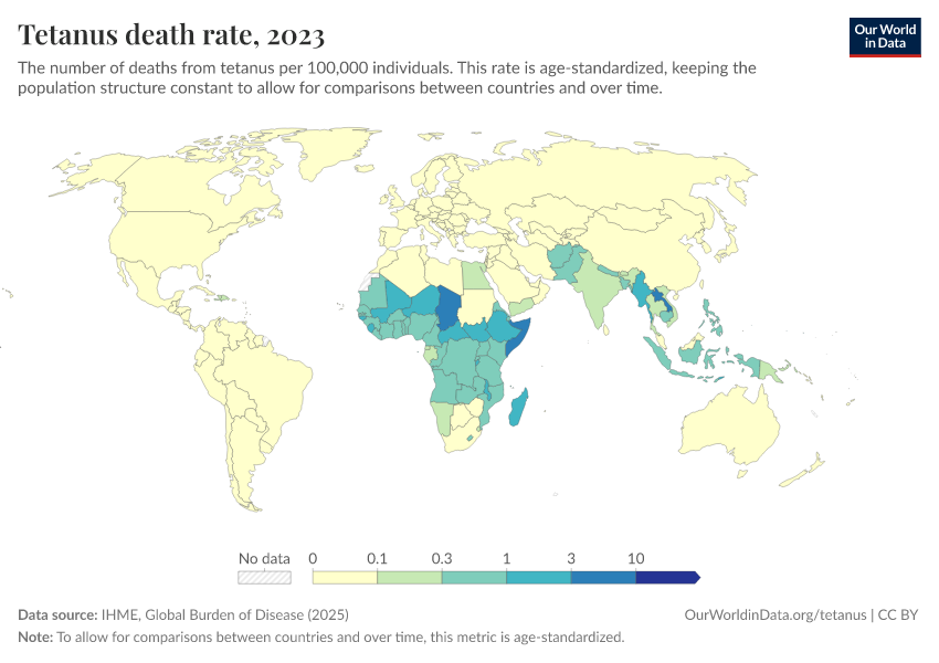 Hannah Behrens, Sophie Ochmann, Bernadeta Dadonaite, and Max Roser (2019) - “Tetanus” Published online at OurWorldinData.org. Retrieved from: 'https://add-force-datapage.owid.pages.dev/tetanus' [Online Resource]BibTeX citation