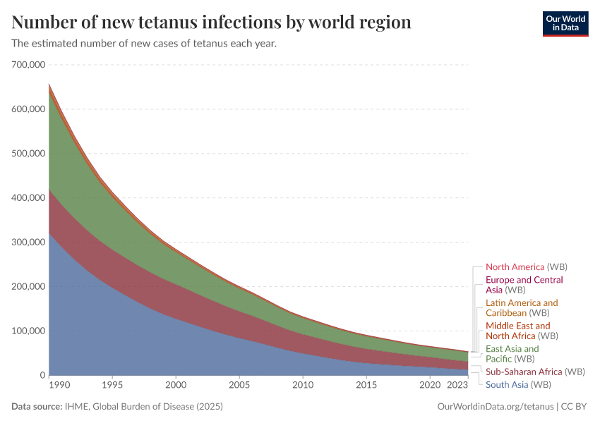 However, even though South Asia still sees more cases of tetanus than any other region, in just three decades the number of new infections has fallen massively, from close to 400,000 infections in 1990 to around 30,000 in 2019.