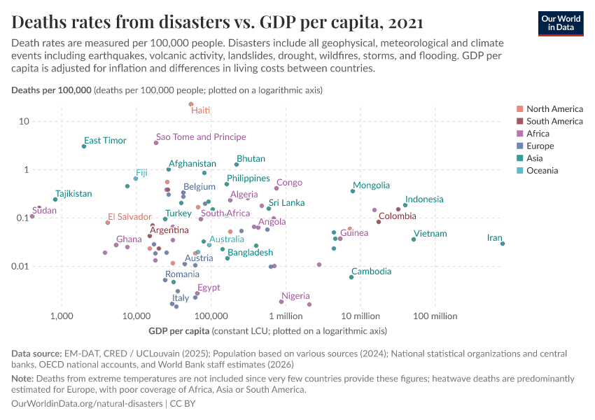 Finally, there is a lot of room for reducing vulnerabilities. Poverty makes people most vulnerable; that’s why I argue that lifting people out of poverty is an essential solution to reducing climate risks. Investing in infrastructure, making agriculture more productive, and building strong political governance are all vital. Poorer countries tend to have higher death rates from disasters, as the chart below shows. (Note that this is on a logarithmic scale.)