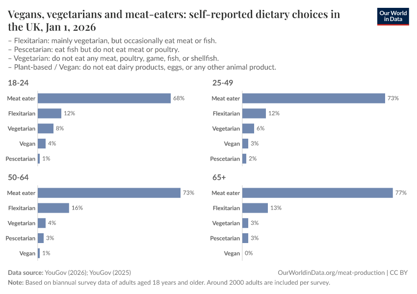 If we want to know about this variation we can rely on survey data on how people describe their dietary preferences. There is, unfortunately, a lack of long-term data on this. But we can look at recent developments.